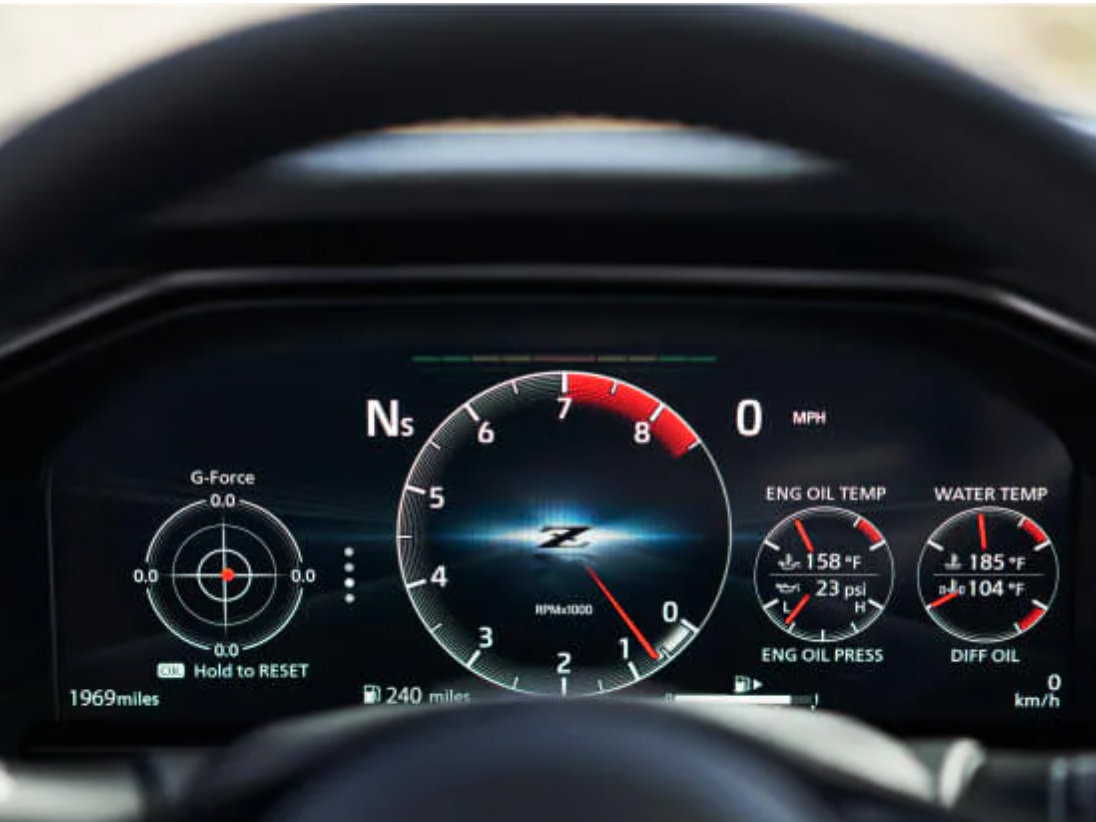 While the two-seat coupe layout remains true to its heritage, the 2025 Nissan Z continues to refine its cabin with modern touches and driver-focused ergonomics. A clean, horizontal instrument panel flows around the driver to create a true sports-car cockpit feel, complemented by padded knee bolsters and a GT-R-inspired steering wheel that enhances grip and control during spirited driving. Premium upgrades like leather-appointed or suede-trimmed seating, power-adjustable sport seats, and available dual-zone automatic climate control give the interior a more upscale edge. Technology also takes a leap forward in 2025 with a larger standard 9-inch infotainment display featuring wireless Apple CarPlay and Android Auto, built-in Wi-Fi hotspot capability, and a fully digital 12.3-inch driver information cluster. We love the smart storage solutions, such as a sliding center armrest with a hidden second cupholder, a dedicated phone holder with USB-A and USB-C ports, and thoughtful touches throughout the cabin. The result is a performance-focused interior that’s also comfortable enough for daily driving or long weekends away.